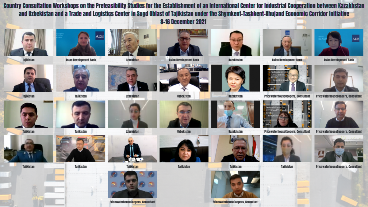 From 8 to 16 December, ADB and the PricewaterhouseCoopers (PwC) India and associated firms conducted five virtual country consultations with public and private sector stakeholders in Kazakhstan, Uzbekistan and Tajikistan on the prefeasibility studies for the establishment of an International Center for Industrial Cooperation between Kazakhstan and Uzbekistan and a Trade and Logistics Center in Sugd Oblast of Tajikistan under the Shymkent-Tashkent-Khujand Economic Corridor (STKEC) initiative. Senior officials from the three countries, including Kazakhstan Vice Minister of Trade and Integration Mr. Kairat Torebayev, Tajikistan Deputy Minister of Economic Development and Trade Mr. Abdurahmon Abdurahmonzoda, and Uzbekistan Head of Department for Development of Transport Corridor of Ministry of Investment and Foreign Trade and CAREC Transport Sector Focal Point Mr. Abdulla Khashimov, delivered welcome remarks. Country Directors for KARM and TJRM, Nariman Mannapbekov and Shanny Campbell, and URM Deputy Country Director Enrico Pinali delivered opening remarks. Participants discussed the proposed scope, methodologies, and timelines for the two studies and identified key issues and opportunities in developing the STKEC.